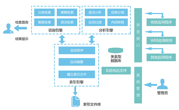 全文检索系统结合"异构网站资源整合"、"异构信息聚合"和"全文检索"技术,对各级各部门政府资源通过采集、聚合、挖掘和检索,实现对跨地区、跨部门的政府资源信息整合和利用。建立起强大的政务信息资源库体系及政府专业搜索引擎平台